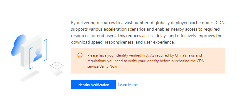 Pengguna terdaftar harus terlebih dahulu menyelesaikan verifikasi identitas agar dapat mengaktifkan CDN. Anda dapat memverifikasi identitas di konsol CDN atau Pusat Akun. Untuk informasi selengkapnya tentang proses verifikasi, silakan baca Panduan Verifikasi Identitas.