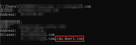 Anda dapat menjalankan perintah nslookup untuk mengueri resolusi DNS nama domain akselerasi CDN Anda.Jika nama domain hasil resolusi tersebut berakhiran dnsv1.com (rekaman CNAME) seperti ditunjukkan pada gambar, itu menunjukkan bahwa layanan akselerasi CDN untuk nama domain Anda telah berlaku.