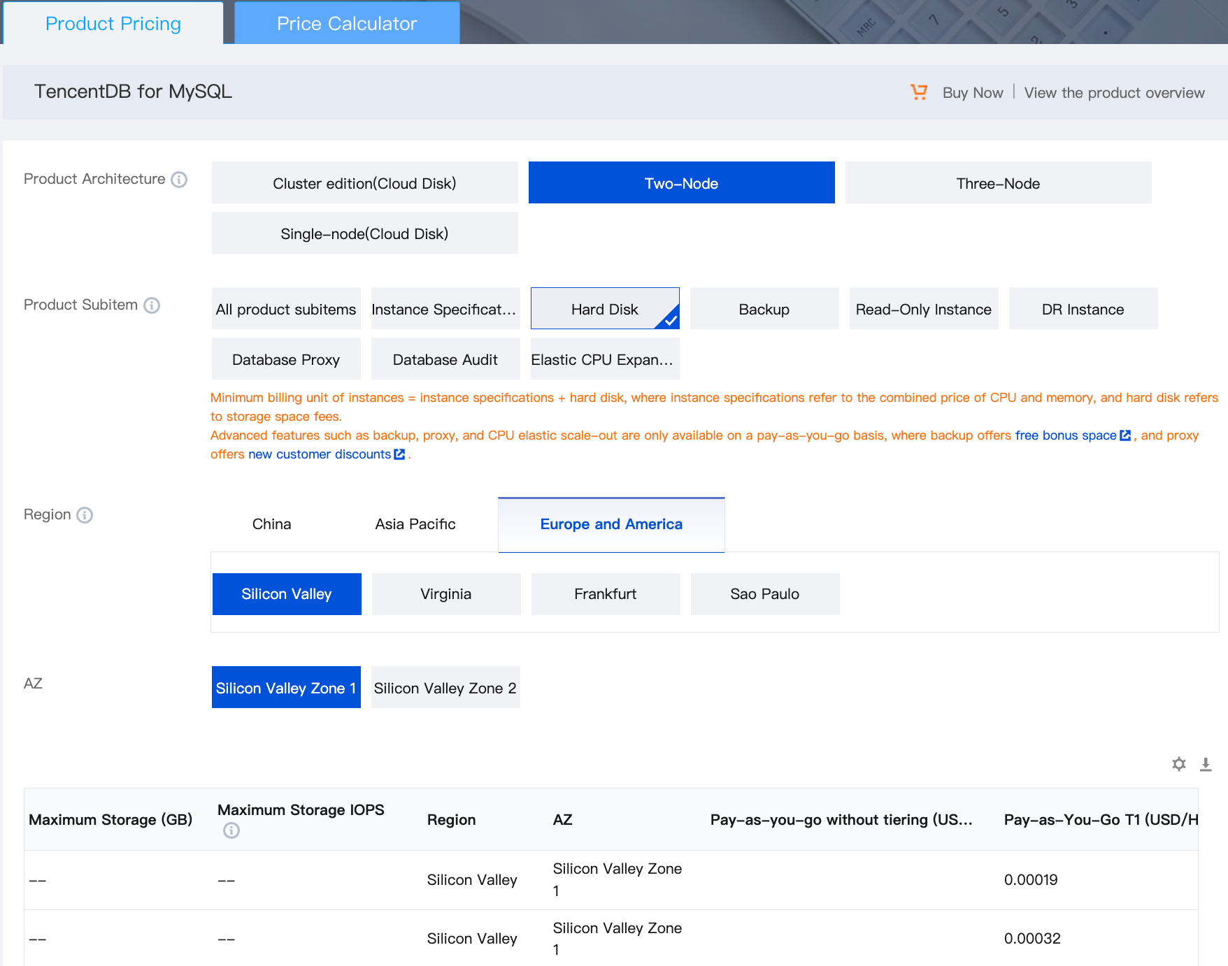 Biaya Ruang Penyimpanan | Biaya ukuran disk yang dipilih di halaman pembelian, mendukung Paket Tahunan/Bulanan dan Pembayaran sesuai pemakaian. Untuk harga, lihat Harga Produk. Ruang penyimpanan digunakan untuk menyimpan file data yang diperlukan untuk operasi TencentDB for MySQL, termasuk ruang tabel bersama, file log kesalahan, REDO LOG, UNDO LOG, kamus data, binlog, dan lainnya. |