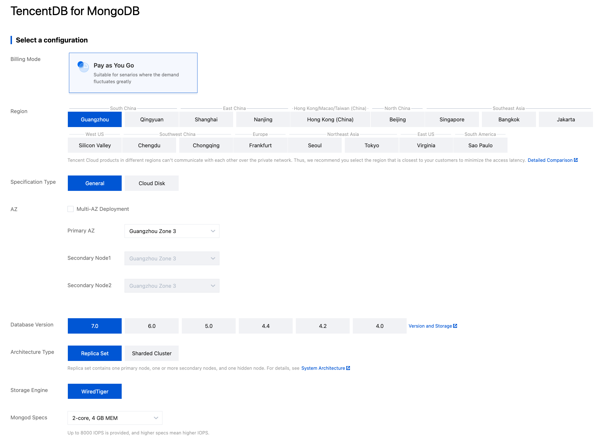 Database Version | Select the latest database version. General Edition (10GE High-I/O Edition): 7.0, 6.0, 5.0, 4.4, 4.2, and 4.0. Cloud Disk Edition: 6.0, 5.0, 4.4, 4.2, and 4.0. |