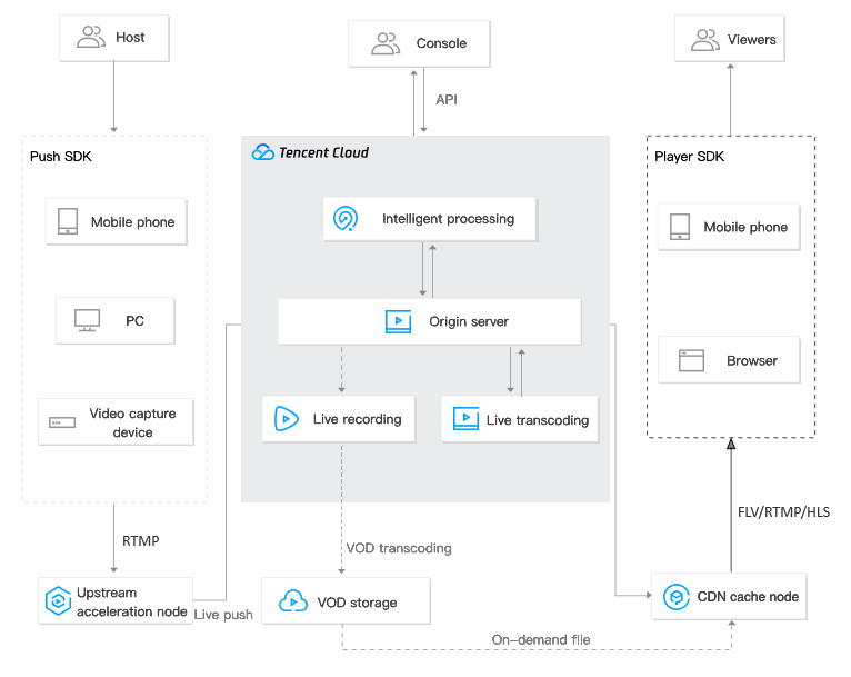 LVB mendukung push RTMP, server asal HLS, dan cara lain untuk mengintegrasikan sumber streaming langsung. LVB juga menyediakan SDK Push RTMP yang mendukung berbagai jenis perangkat dan bitrate upstream adaptif. Selain itu, LVB menawarkan beberapa kemampuan, misalnya streaming instan dari frame pertama, tingkat kemacetan rendah, perekaman layar, dan peralihan resolusi yang mulus untuk memenuhi kebutuhan dalam berbagai skenario. LVB juga mendukung pemutaran ulang di semua klien dan pengembangan khusus.