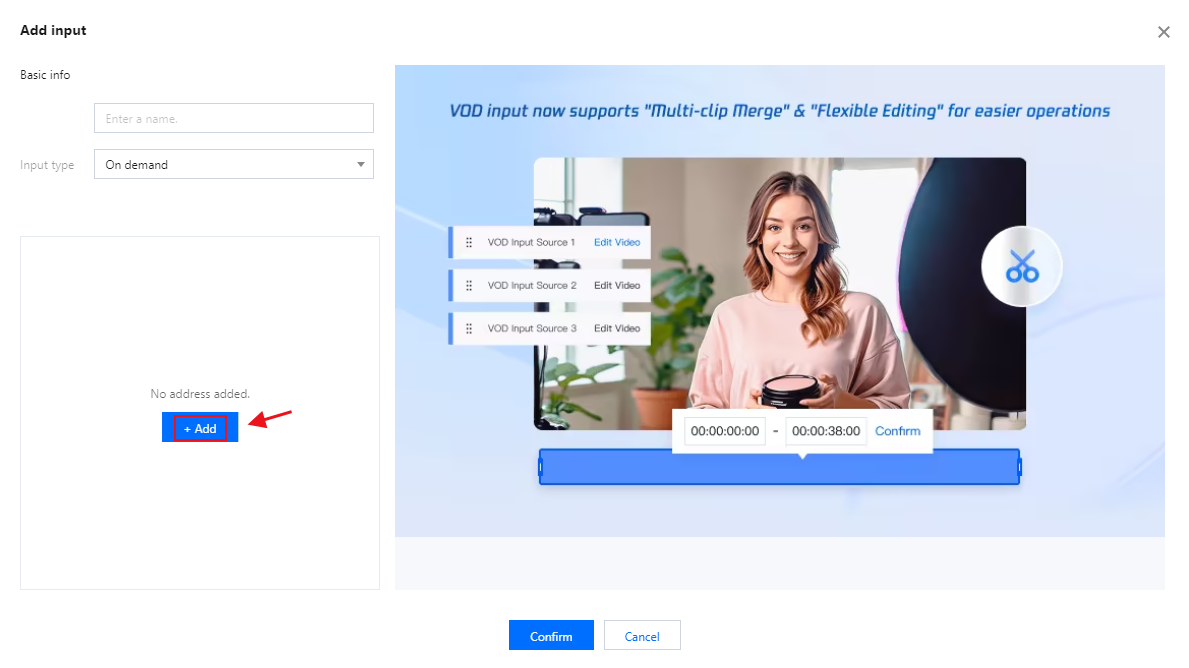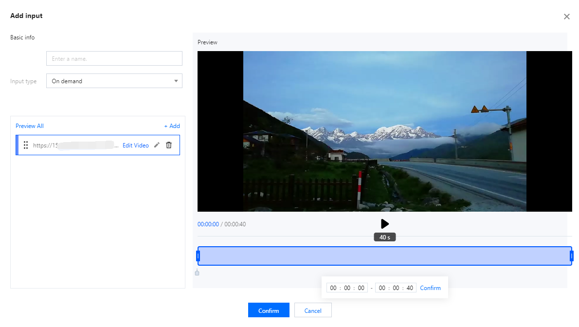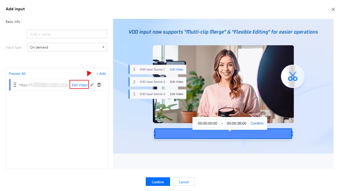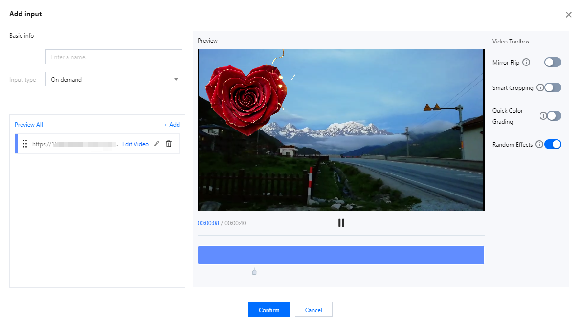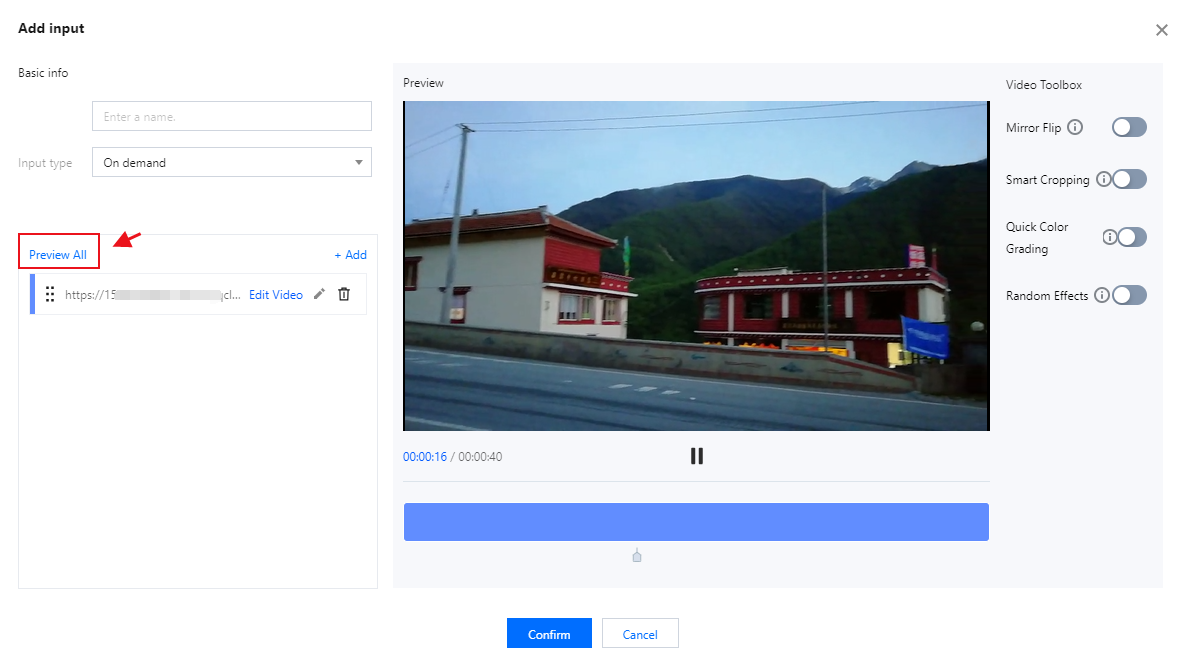 On demand(editable) | Input name: Custom Input type: On demand URL. Click Add URL. Supports media files stored in Tencent Cloud COS and media files stored by other providers. Supports the MP4, HLS, and FLV formats. You can enter multiple on-demand file URLs separated with semicolons (;). The console automatically cycles through the files in the list. Click on any on-demand source to edit it; you can then modify the selected on-demand file. The playback progress and total duration are displayed in the bottom-left corner of the video. The editing bar located beneath the video allows you to make adjustments by dragging the markers or by entering specific time values into the input fields. Click the Play button to preview your edits. Multiple VOD file URLs are supported; please separate them using semicolons (;). The console will automatically play the files within the list in a loop. Edit Input Source Click Preview All(The Video Toolbox on the right currently offers four tools for you to choose from—Mirror Flip, Smart Cropping, Quick Color Grading, and Random Effect)which can be optionally enabled for use. Mirror Flip:Flips the video horizontally for a mirror effect. Smart Cropping:Auto-frames the shot around the main subject. Quick ColorGrading:Applies a cool color tone to the video. Random Effects:Adds random special effects and gifts to the video. |