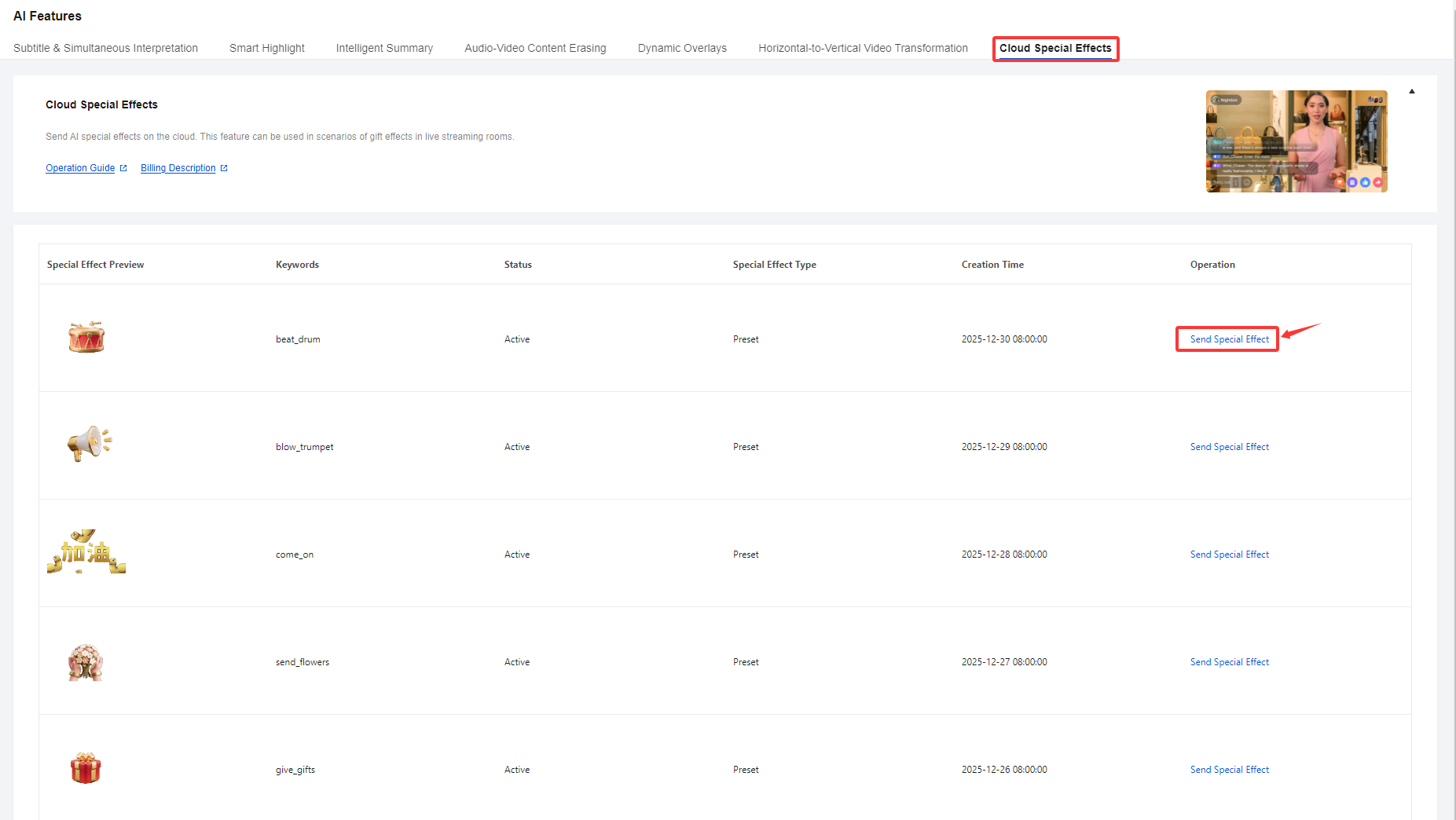 1. Log in to the CSS Console and navigate to Feature Configuration > AI Features > Cloud Special Effects, Click Send Special Effect. 2. In the pop-up page, check Online Live Stream and click Confirm to Send Special Effect.