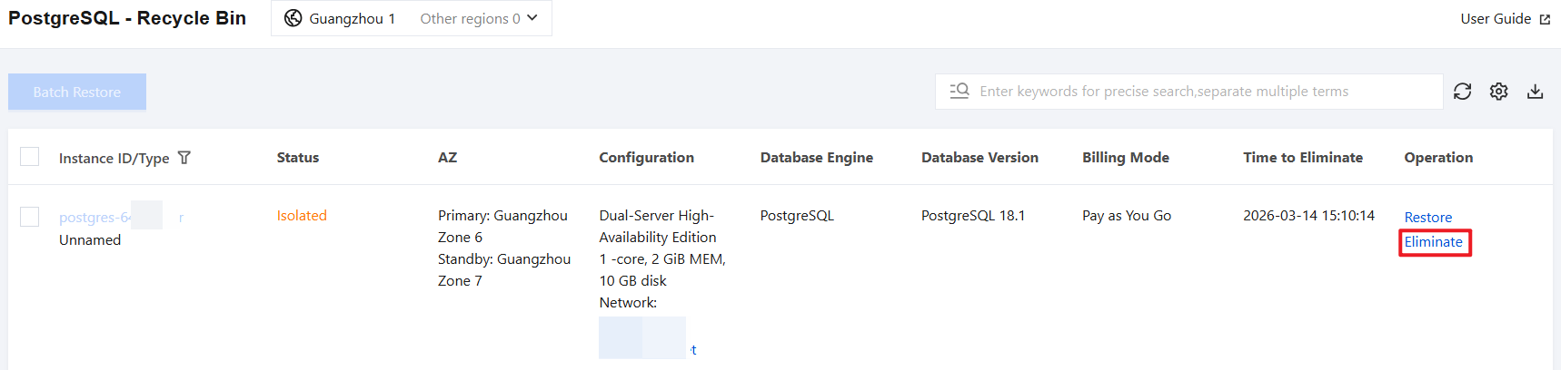1. Log in to the TencentDB for PostgreSQL console, locate the desired instance in the recycle bin list, and click Eliminate in the Operation column.