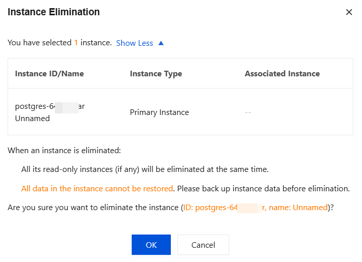 If a primary instance has one or more read-only instances which are running normally, the read-only instances will be eliminated along with the primary instance. To prevent instances from being eliminated due to overdue payment, please pay attention to the instance expiration information.