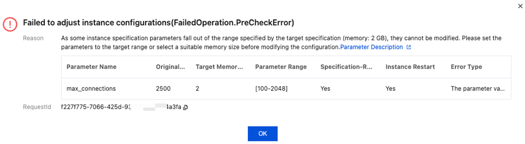 When the instance configuration is adjusted, the system checks whether the runtime values of the instance specification-related parameters exceed the upper limit of the corresponding range after the instance specification is modified. If the upper limit is exceeded, a corresponding prompt will be displayed. As shown in the figure below: