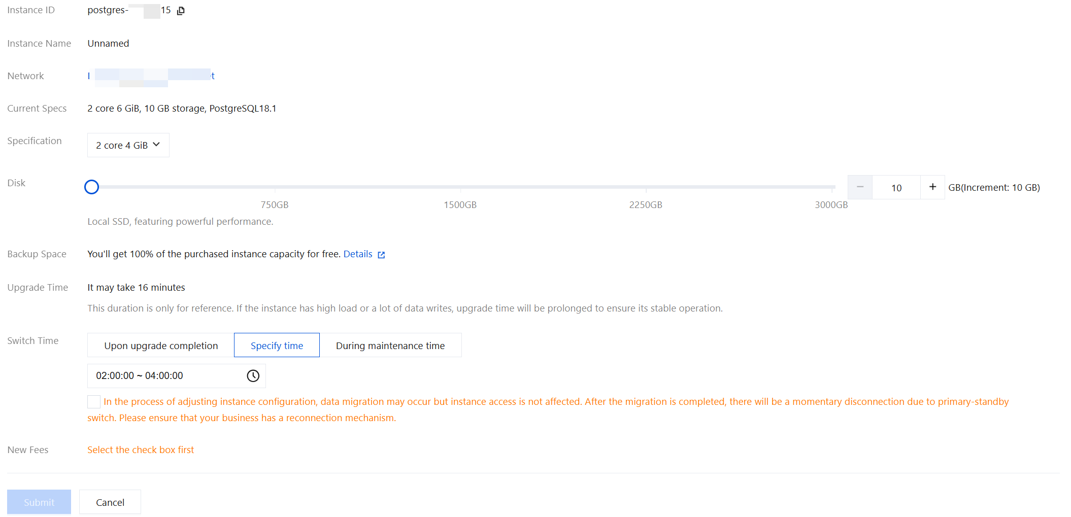 As the instance configuration adjustment involves instance data migration, the adjustment process will be completed with a primary/secondary switch, which will cause an instantaneous disconnection and slightly affect business access to the database instance. Therefore, we recommend you set the switch time within off-peak hours.