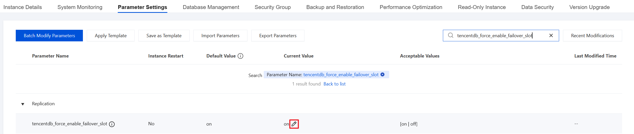 TencentDB for PostgreSQL has added a new parameter failover_slot_timeline_diverged_option with the type of enum, which is convenient for you to configure for abnormal situations. You can log in to the TencentDB for PostgreSQL console, and configure this parameter on Instance Details > Parameter Settings. The default value of this parameter is error, and the optional values are error and rewind. In extreme cases, the log receiving speed of the standby database is slower than that of logical replication and the HA switch occurs. If error is set as the value, it means that logical replication will be paused, and both the publisher and subscriber can receive an error report and wait for you to process it. If the value is set to rewind, the logical replication will start from the time point when the switch is performed. Note