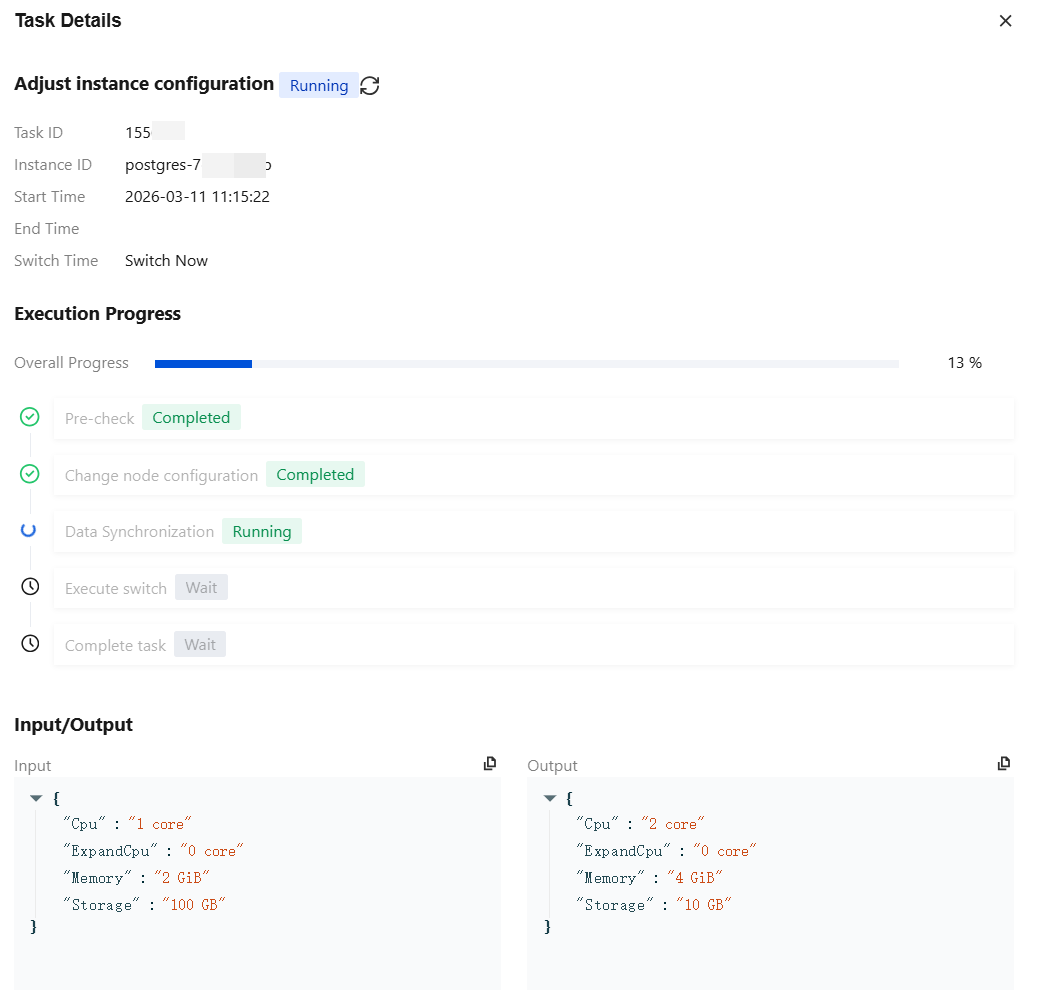 Adjusting the Instance Configuration | { "Cpu":"2 core"//CPU configuration before instance adjustment. "Memory":"4 GiB"//Memory configuration before instance adjustment. "Storage":"10 GB"//Storage space configuration before instance adjustment. } | { "Cpu":"2 core"//CPU configuration after instance adjustment. "Memory":"4 GiB"//Memory configuration after instance adjustment. "Storage":"20 GB"//Storage space configuration after instance adjustment. "Message":"success"//Task-specific return, success represents success. For other statuses, see specific information. } |