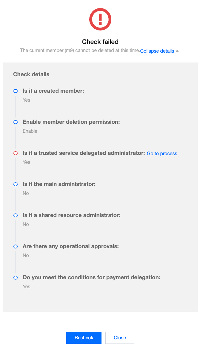 詳細表示をクリックして、具体的なチェック結果を参照できます。ページの指示に基づいて不適合項目を手動で処理し、処理完了後に再度メンバーを削除してください。