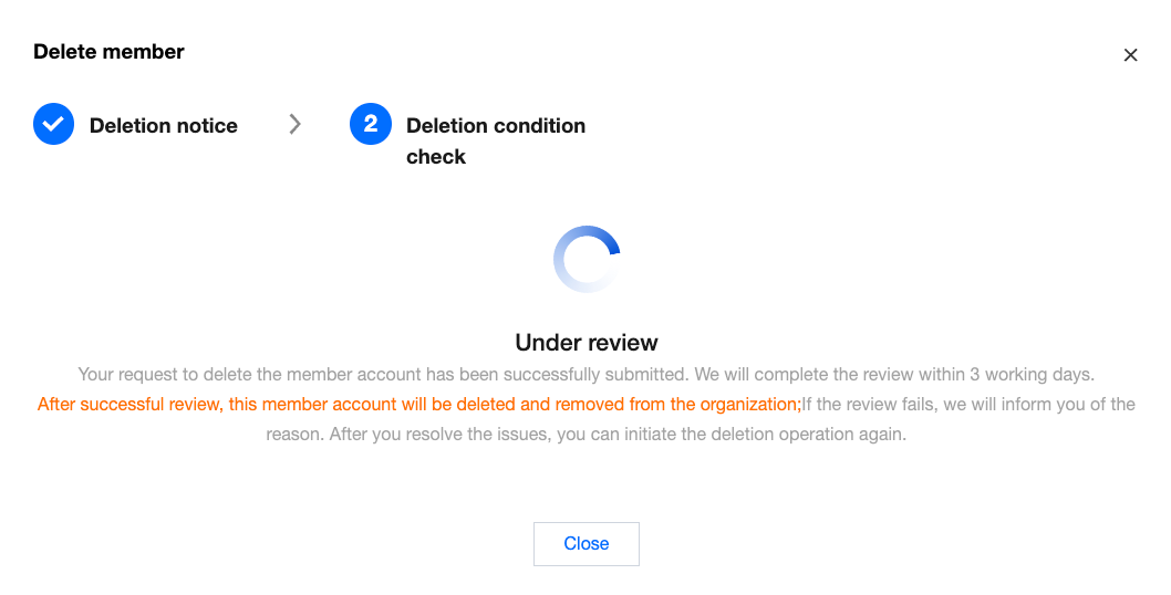 審査が成功した後、当該メンバーアカウントは直接削除され、組織から削除されます。