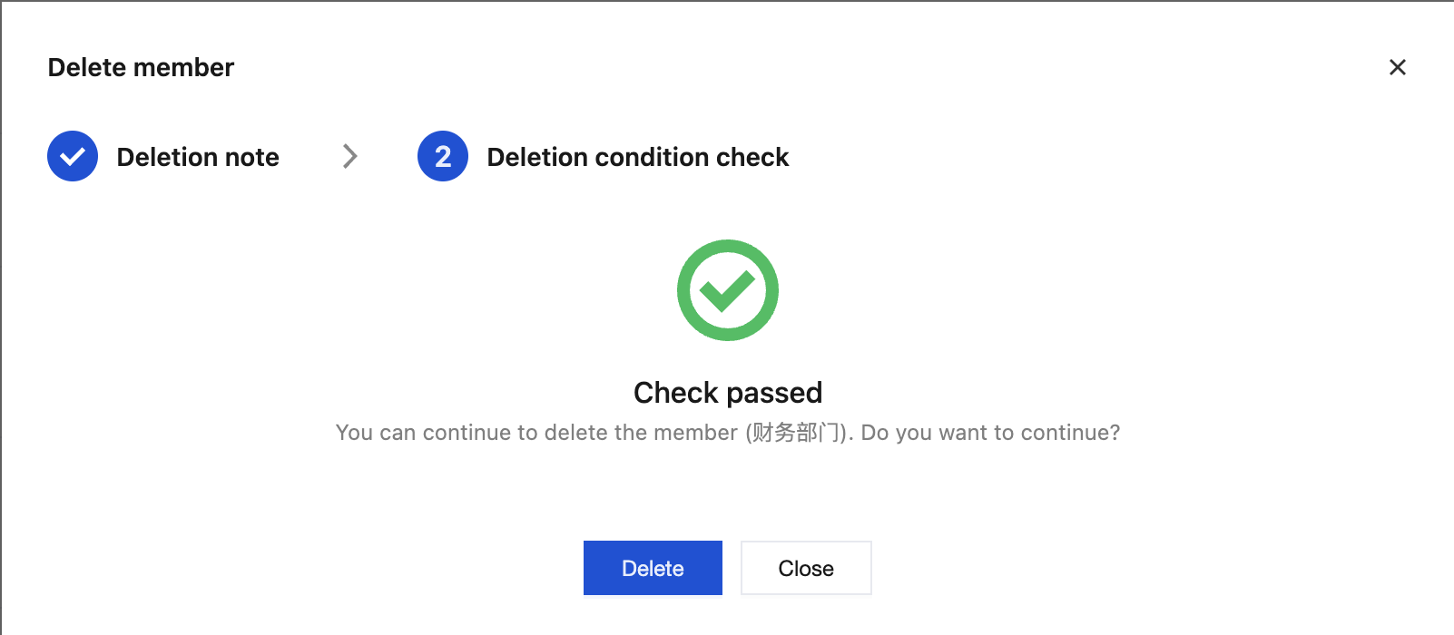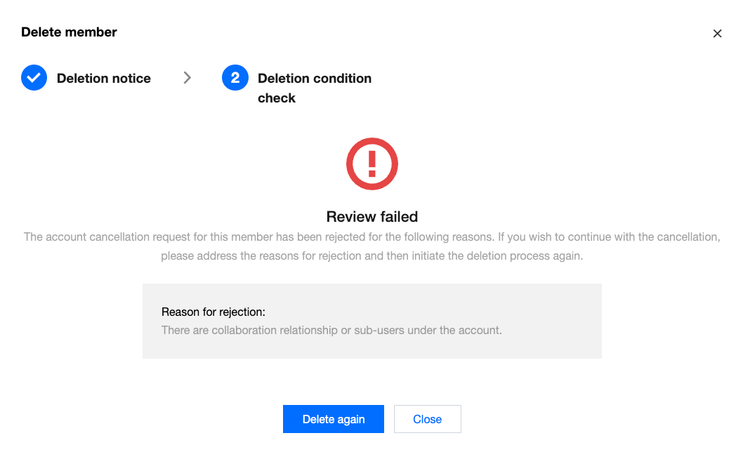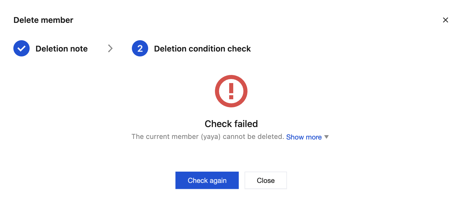 メンバーを削除する前に、システムはメンバーがアカウント削除の要件を満たしているかどうかをチェックします。削除条件を満たしていないメンバーについては、ページの指示および『アカウント削除』を参照して処理した後、再度メンバーを削除してください。 2. 操作手順