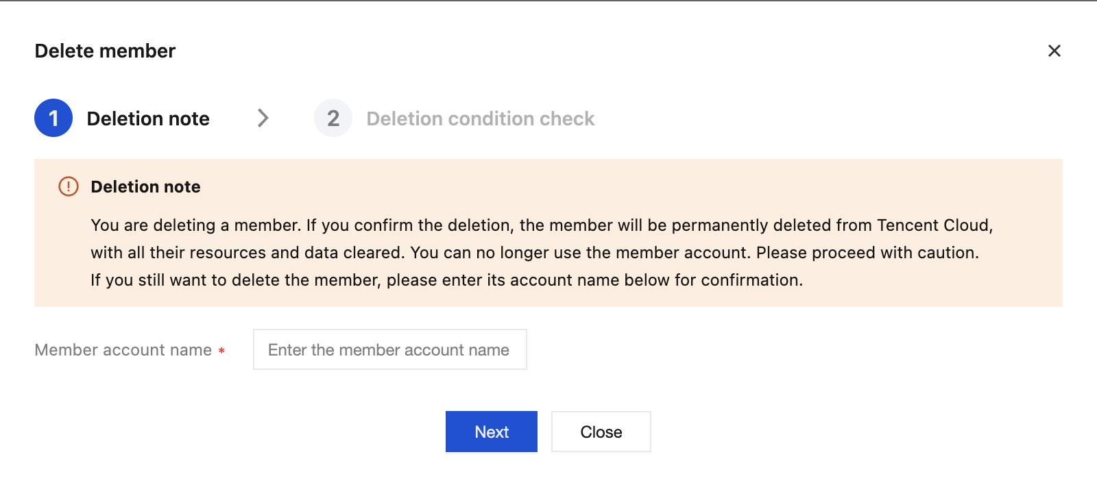 4. メンバー削除ページで、削除に関する注意事項をよく読み、メンバーのアカウント名を入力し、次へをクリックします。