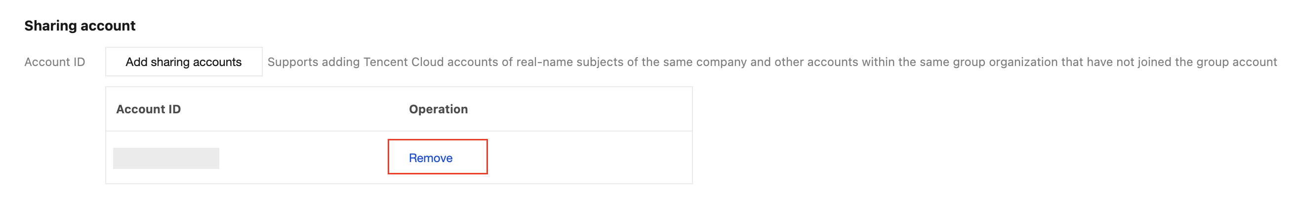 共有アカウントを追加:共有アカウントを追加をクリックし、ポップアップ表示された共有アカウントを追加ウィンドウで、共有対象アカウントを選択または手動で追加した後で、保存をクリックします。詳細は共有ユニットの作成を参照してください。 共有アカウントを削除する:削除対象の共有アカウントがある行の右側の削除をクリックします。下図の通り:
