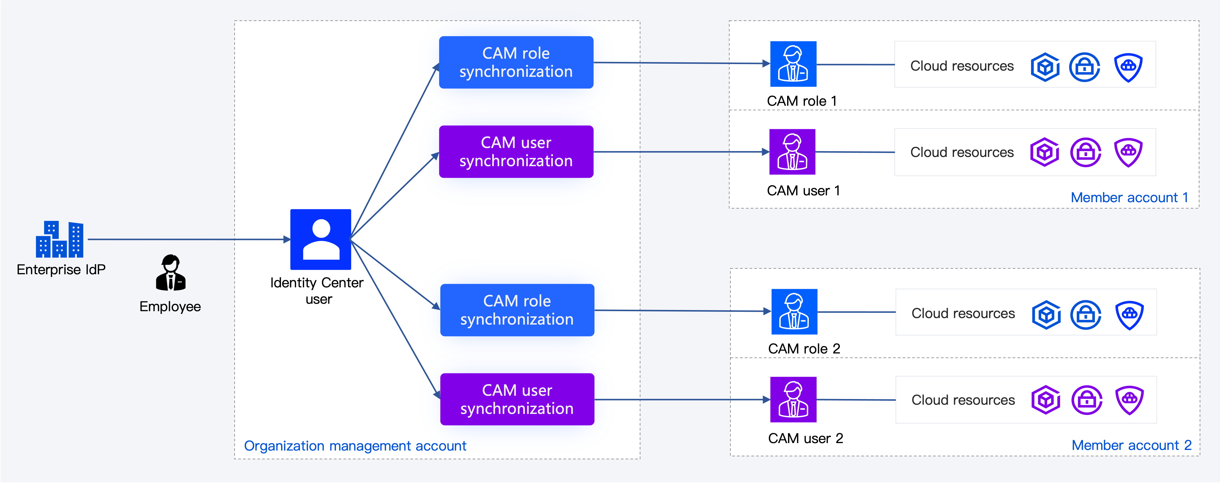 アイデンティティセンターのユーザーは、CAMロールまたはCAMユーザーを介してアカウントのクラウドリソースにアクセスできます。