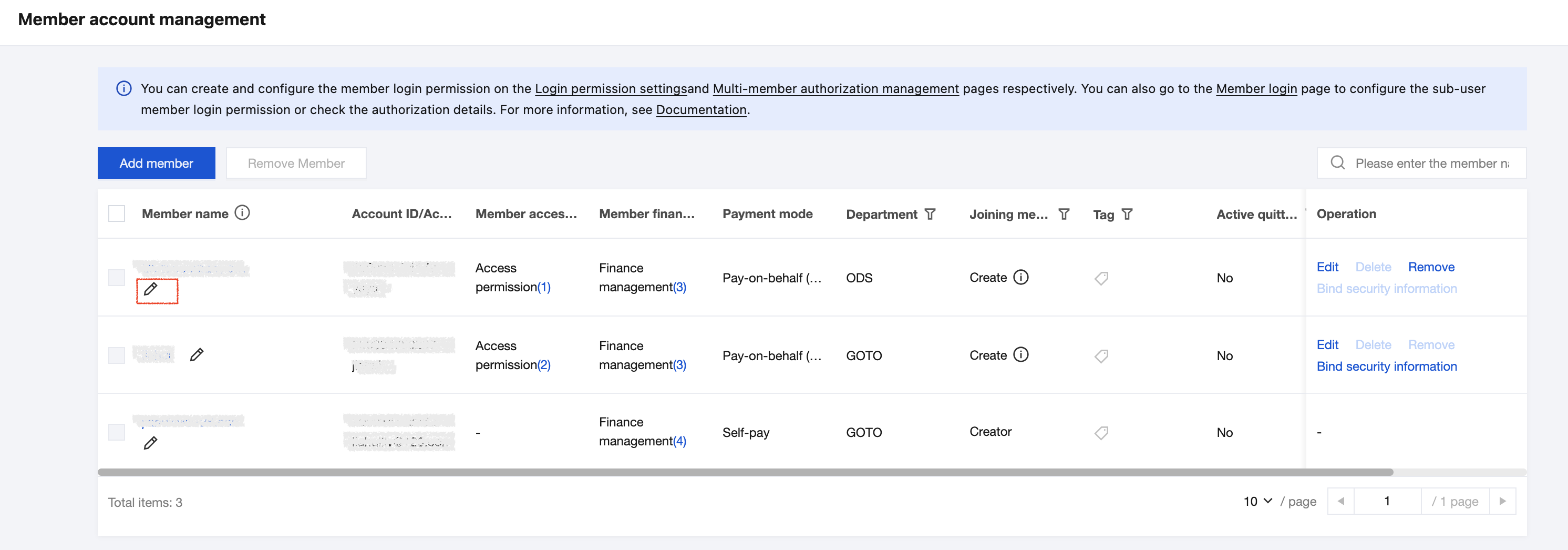 またはメンバーアカウント管理をクリックして、メンバーアカウント管理ページに入ります。