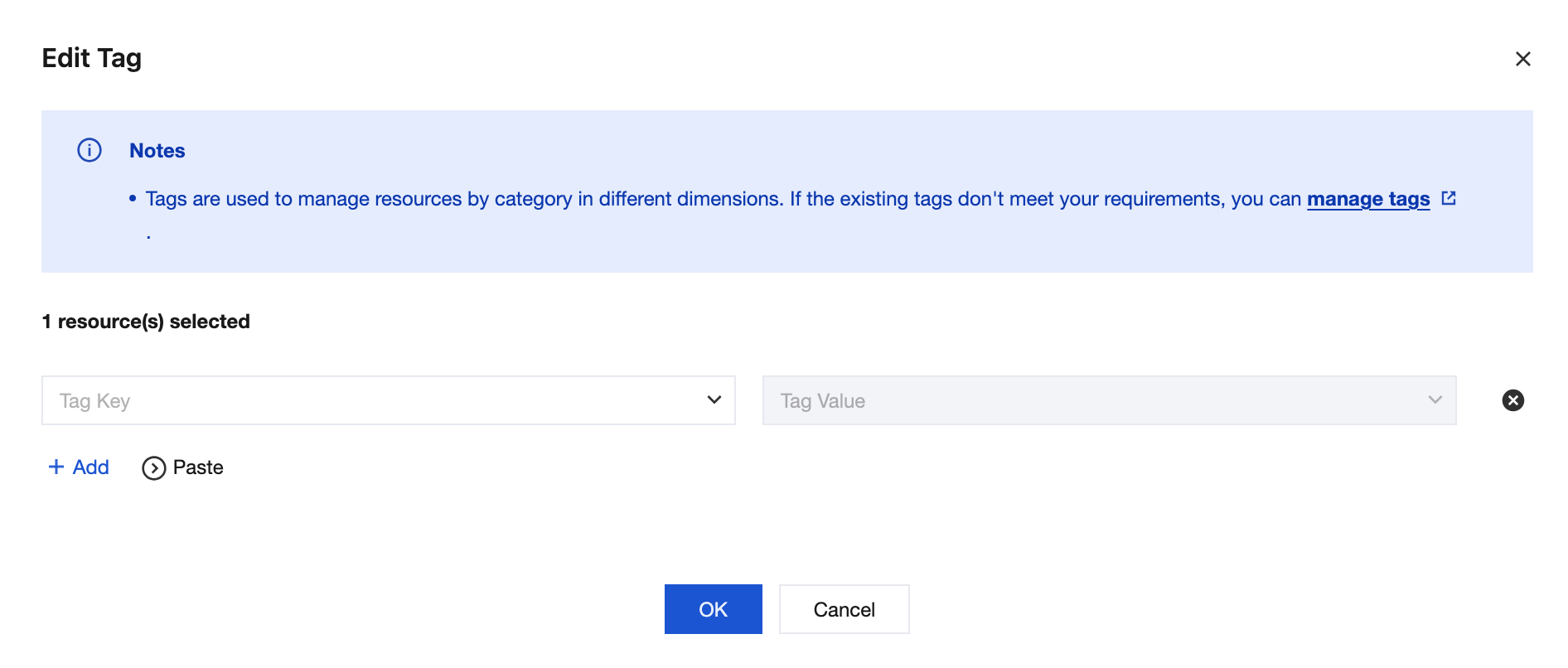 4. Tag編集画面で、ドロップダウンリストからTagのキーと値を選択します。現在のTagのキーと値が要件を満たせない場合は、Tagコンソールに移動して新規Tagを作成してください。詳細については、Tagの作成とリソースへのバインドを参照してください。 説明: