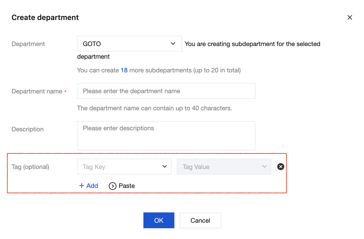 5. 確定をクリックして、部門の作成とTagのバインドを完了します。