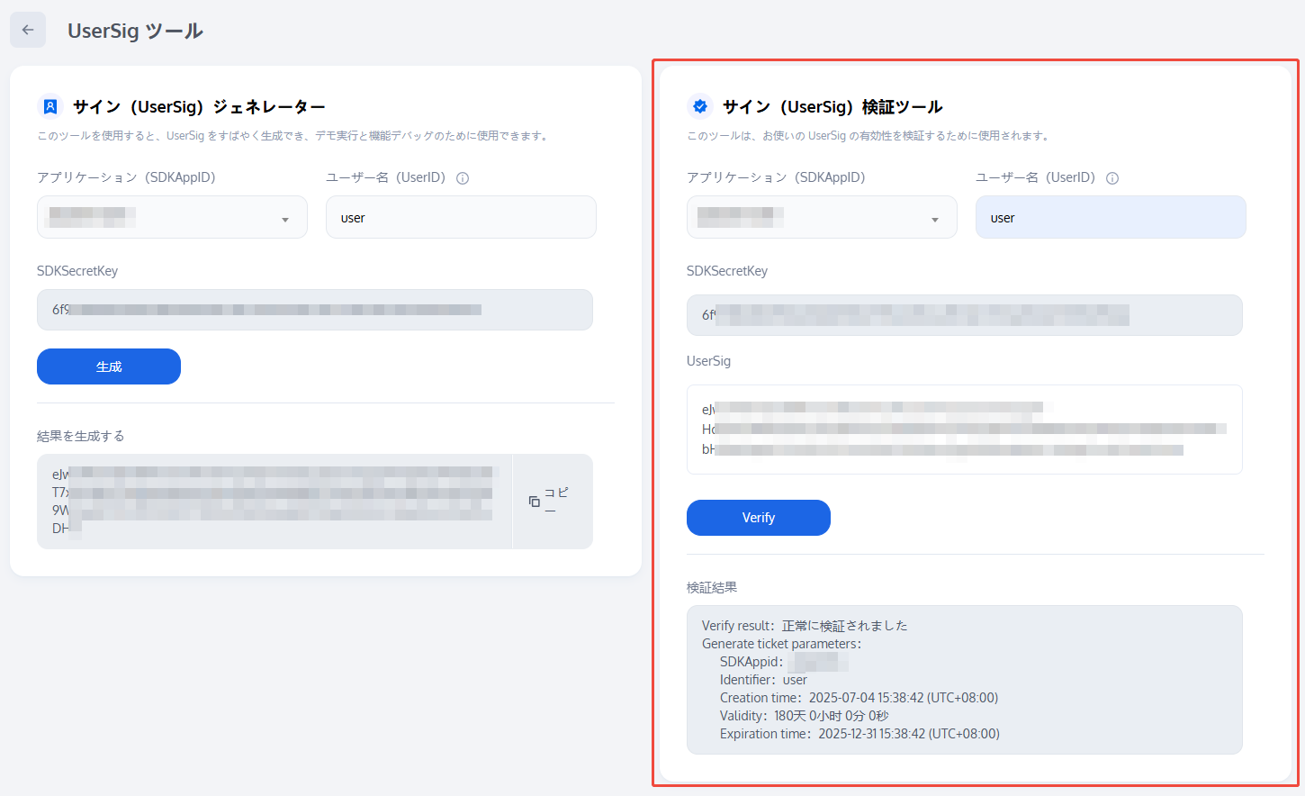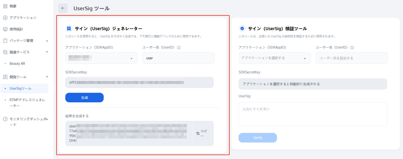 2. 左側のナビゲーション・バーで、開発支援ツール>UserSigツールを選択します。 2. 署名(UserSig)検証ツールエリアに、UserIDとUserSigを入力します。