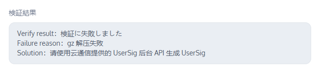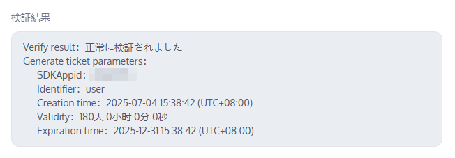 検証が成功すると、このUserSigに対応するSDKAppID、UserID、生成時間、有効期間および期限切れ期間を表示することができます。