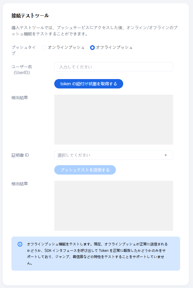 プッシュの成功が表示された場合、コンソールに入力した証明書情報に誤りがなく、SDKインターフェースを呼び出してTokenがアップロードされたことを意味します。ユーザーのクライアントステータスチェックツールを使用して、さらにトラブルシューティングを行うことができます。 失敗が表示された場合、具体的な失敗原因とそのソリューションを表示することができます。