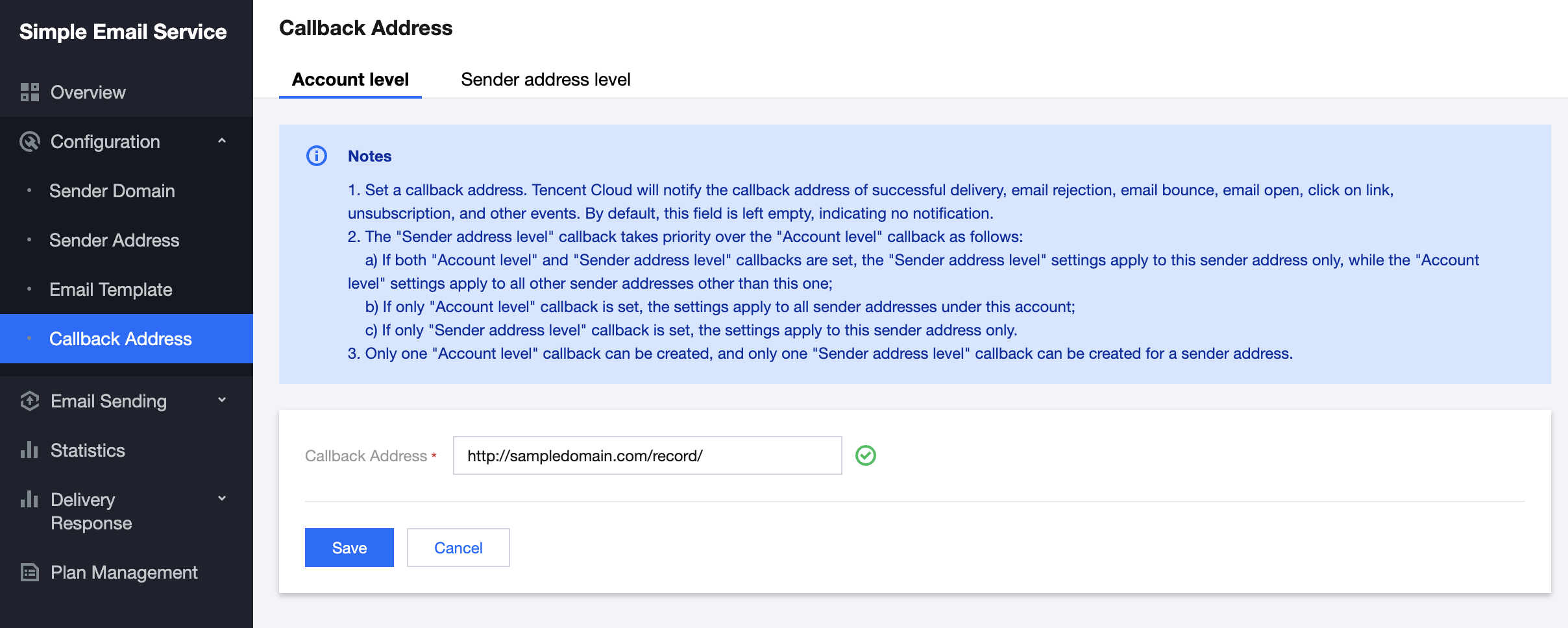 「アカウントレベル」のコールバックの設定のみが、現在のアカウントのすべての送信アドレスに対して有効になります。