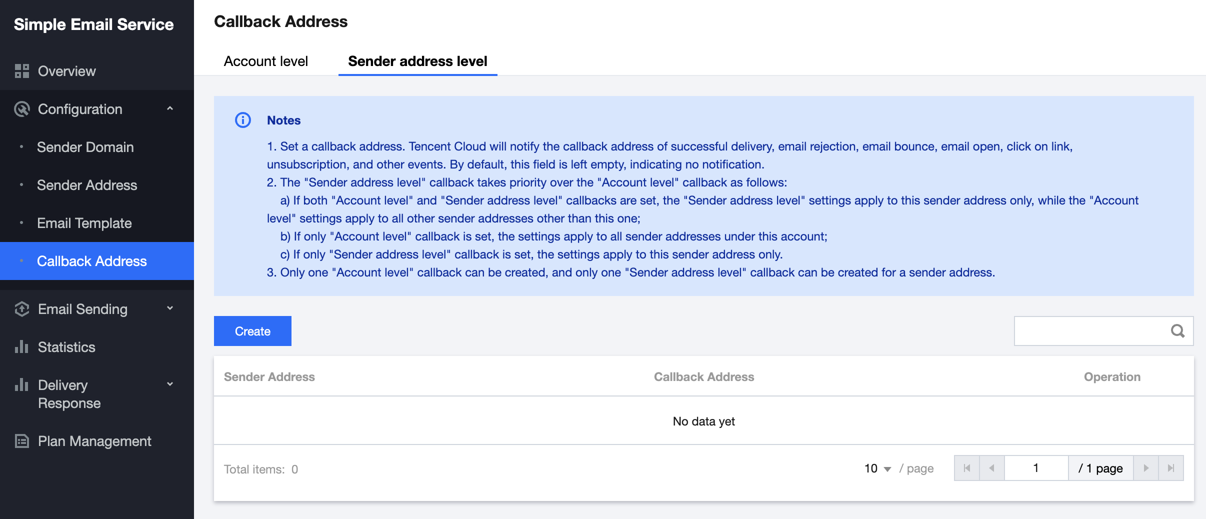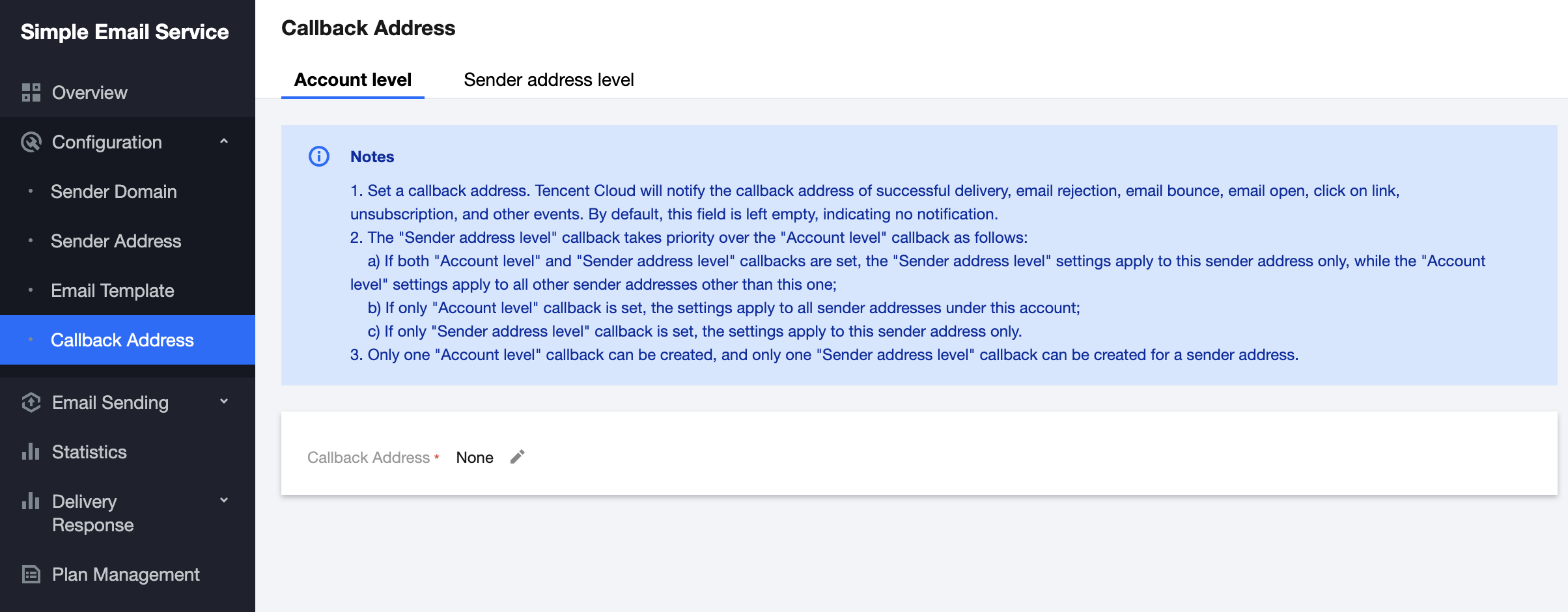 1. コールバックアドレスには、「アカウントレベル」と「送信アドレスレベル」の2種類があります。デフォルトでは、コールバックアドレスは空です。つまり、通知しません。「アカウントレベル」のコールバックアドレスは、当該アカウント内のすべての送信アドレスに対して有効です。「送信アドレスレベル」のコールバックアドレスは、対応する送信アドレスに対してのみ有効です。