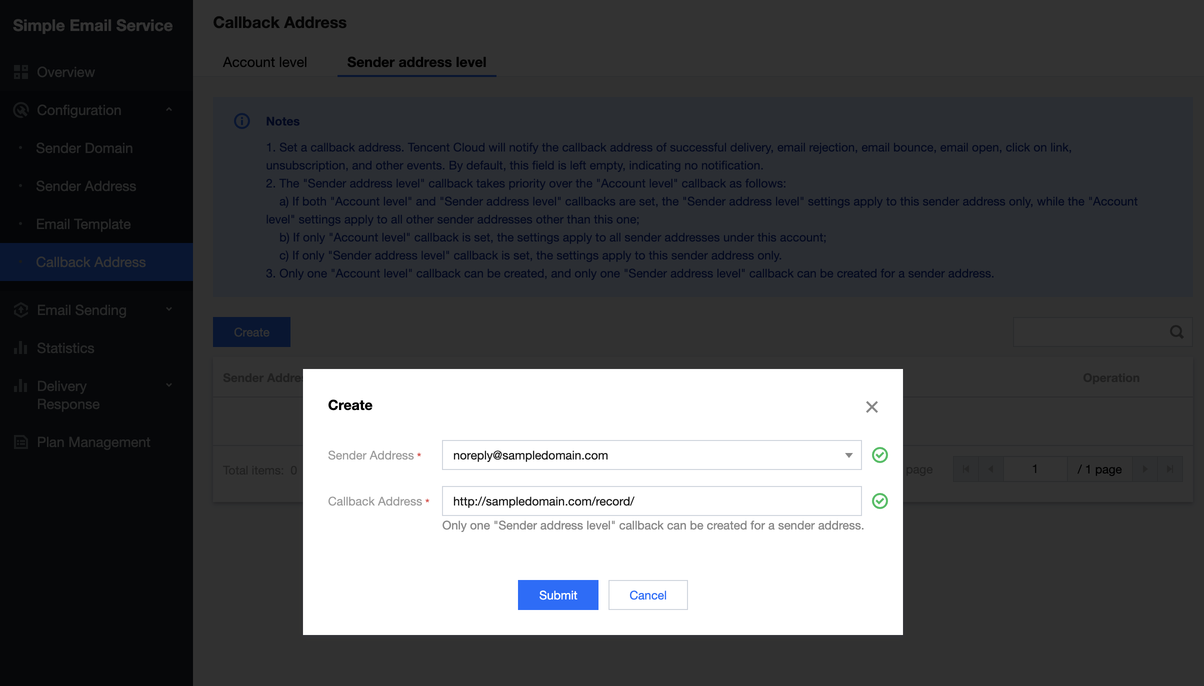 3. 作成できる「アカウントレベル」のコールバックは1つのみです。1つの送信アドレスごとに作成できる「送信アドレスレベル」のコールバックは1つのみです。