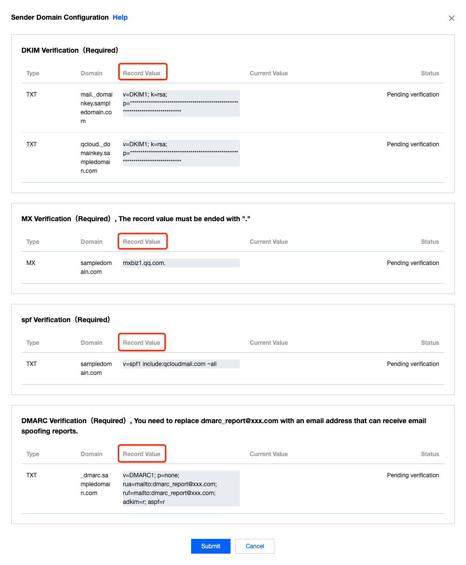 送信ドメイン名がメインドメイン名ではなく、例えばabc.sampledomain.comの場合、ホストレコードにはqcloud._domainkey.abcと入力します。