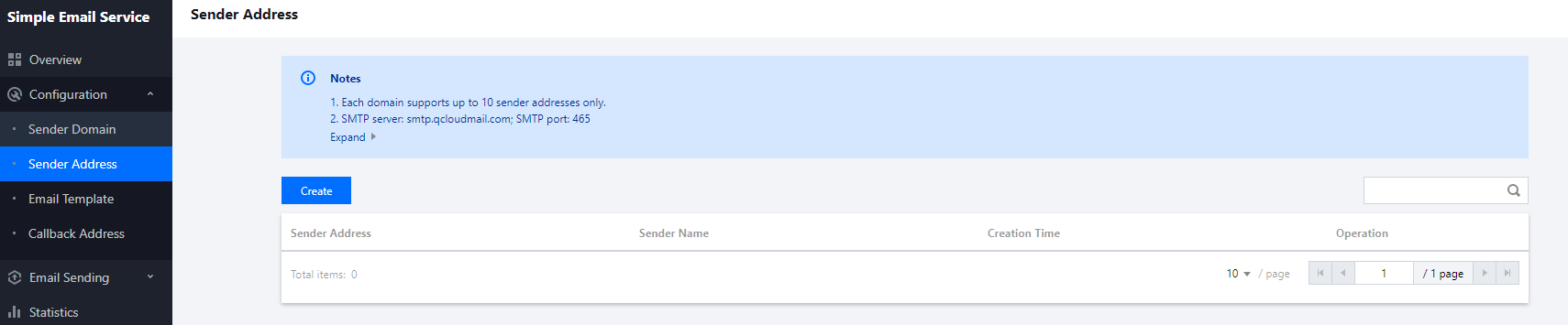 SESコンソールにログインし、左側ナビゲーションバーの「メール設定-送信元アドレス」をクリックし、送信元アドレスページに進みます。 ステップ2:SMTPパスワードの設定