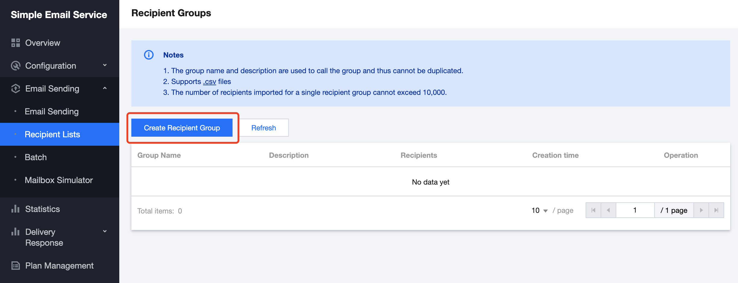 1. SESコンソールにログインし、メール送信 > 受信者リストを選択し、受信者リスト画面に進みます。受信者リストの新規作成をクリックします。 2. 受信者リストの新規作成画面で、対応する内容を入力後、送信をクリックします。