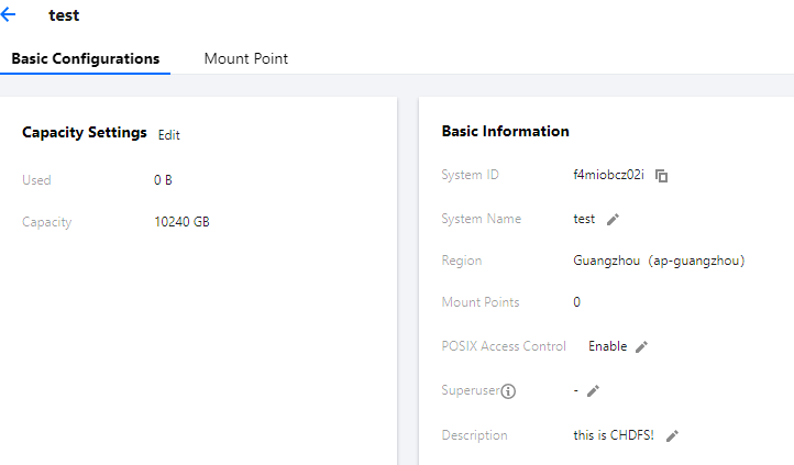 1. CHDFSコンソールにログインし、左側ナビゲーションバーの【ファイルシステム】をクリックして、広州など、必要とするリージョンを選択します。 2. 【新規作成】をクリックし、ファイルシステムの新規作成ページに名前と説明を入力します。