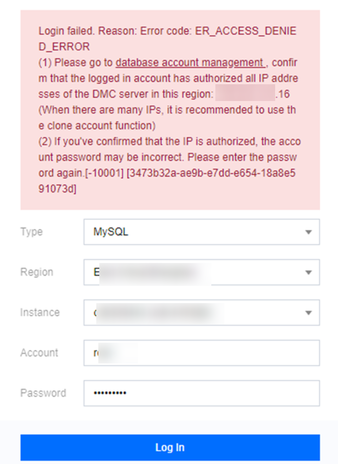 Cause 2: You have not authorized the DMC server address to access the database. You will be prompted for such authorization on the error page for the IP address in the security group or database account.