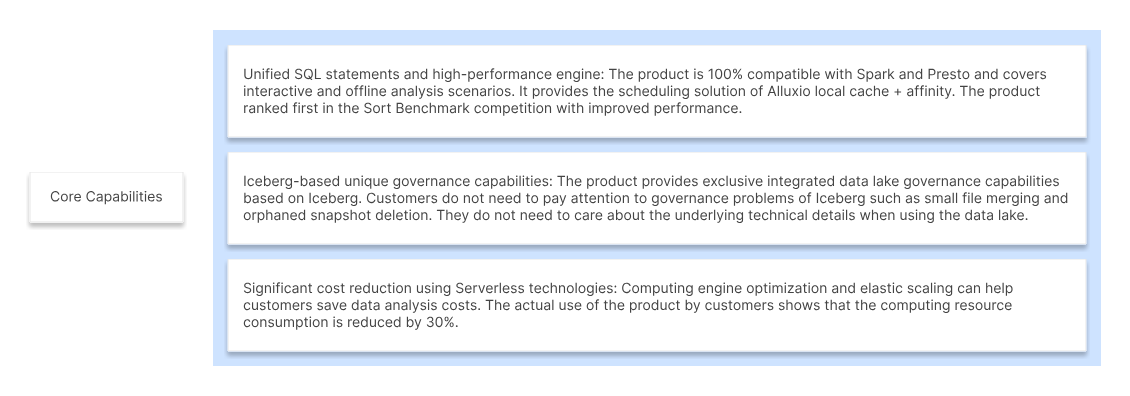 データレイクハウス一体化アーキテクチャを対象とした統一SQL分析およびバッチジョブ処理を実現し、統一されたデータレイクアーキテクチャを通じてエンタープライズレベルのBI、機械学習、データサイエンスシナリオを完全にサポートします。