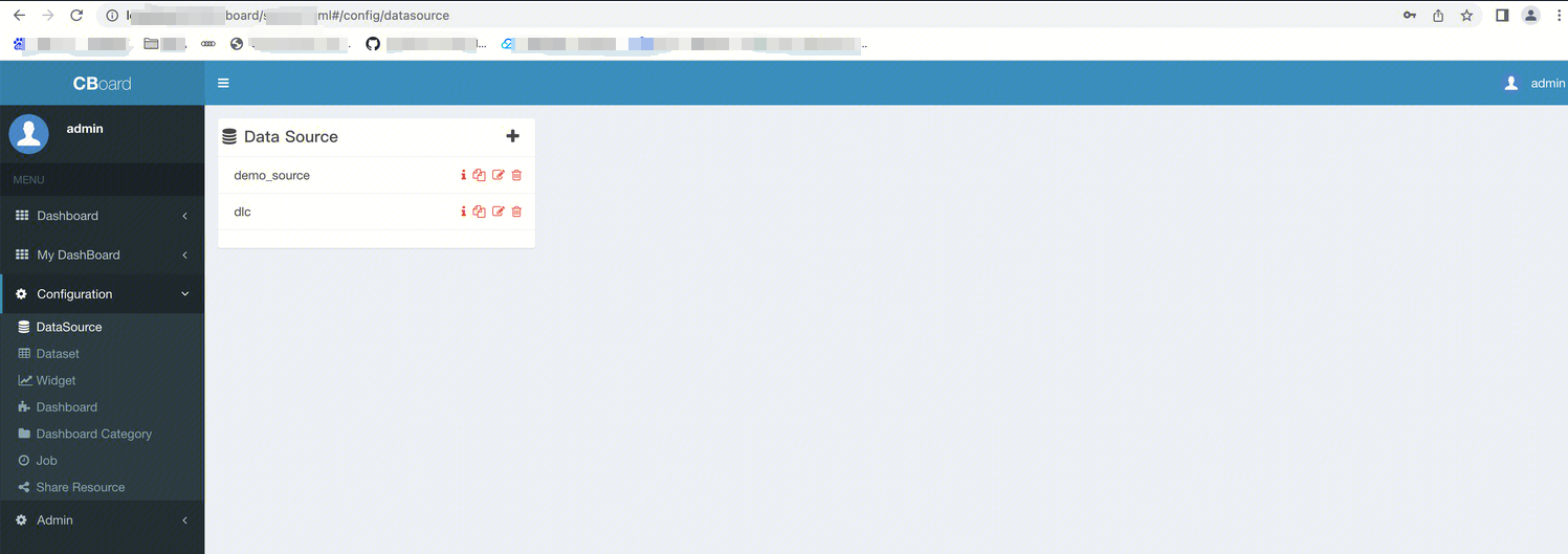 cboardのconfigurationにあるdatasource管理でdlc接続を追加します。