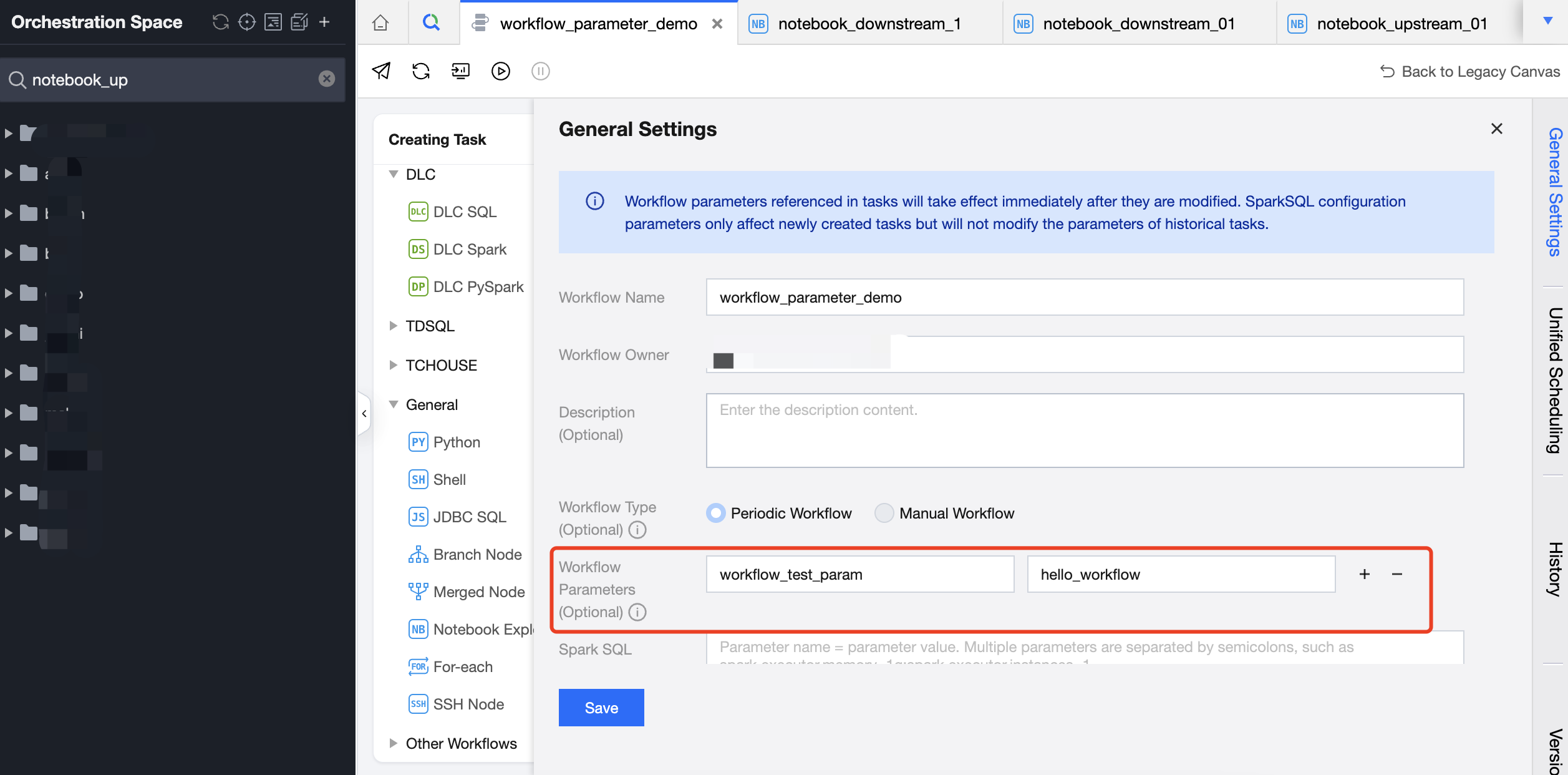 # get workflow_test_param value# When testing and running in the notebook space,# default values need to be set because the notebook file has not yet been associated with a workflow.try:workflow_test_param_value = dlcutils.params.get("workflow_test_param")if not workflow_test_param_value: # 取得した値が空文字列の場合workflow_test_param_value = 'workflow_default_value'except Exception: # パラメータを完全に取得できない場合workflow_test_param_value = 'workflow_default_value'print(f"Using toy value: {workflow_test_param_value}")