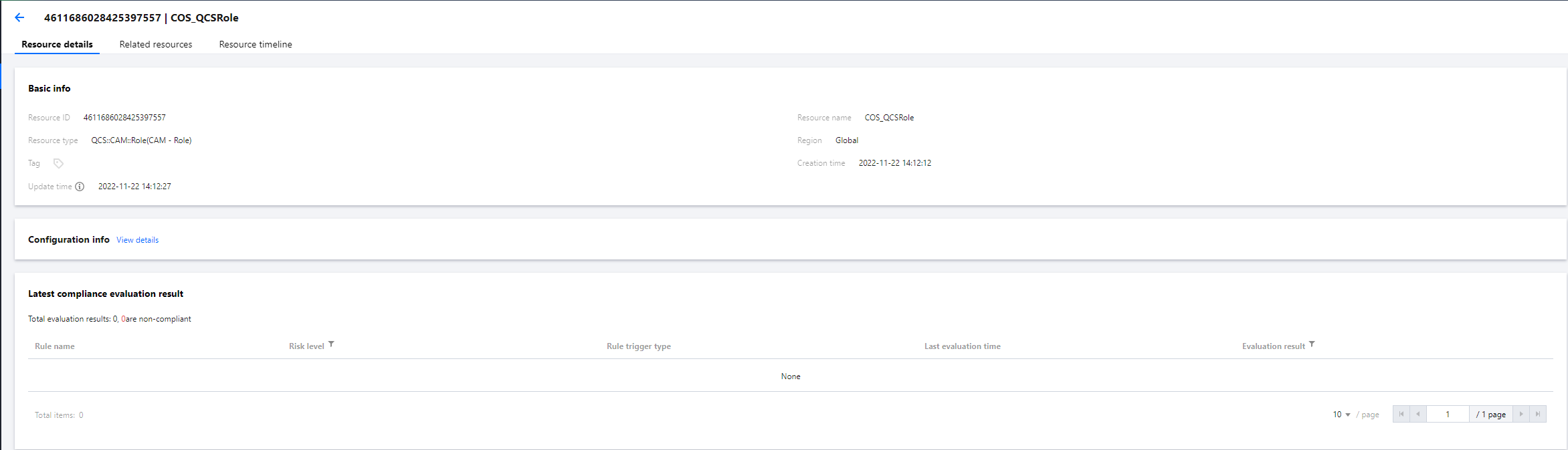 リソース詳細は、リソースの最新更新の属性情報、構成情報、および最新のコンプライアンス評価結果を表示しています。詳細については、用語集を参照してください。 関連リソースを