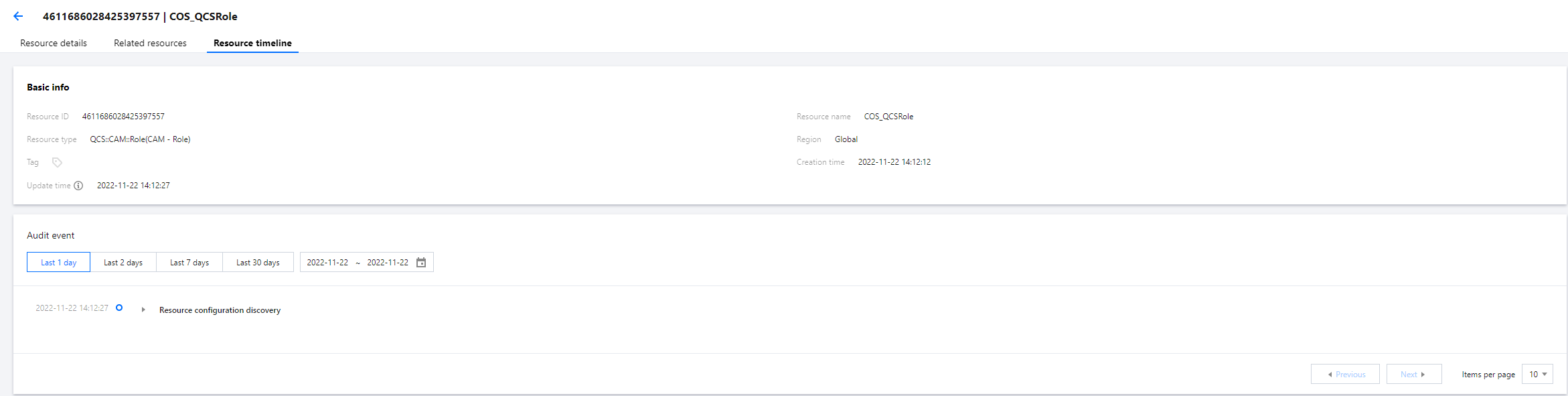 リソースタイムラインページに切り替えると、過去1年以内の当該リソースのすべての構成変更履歴を照会できます。