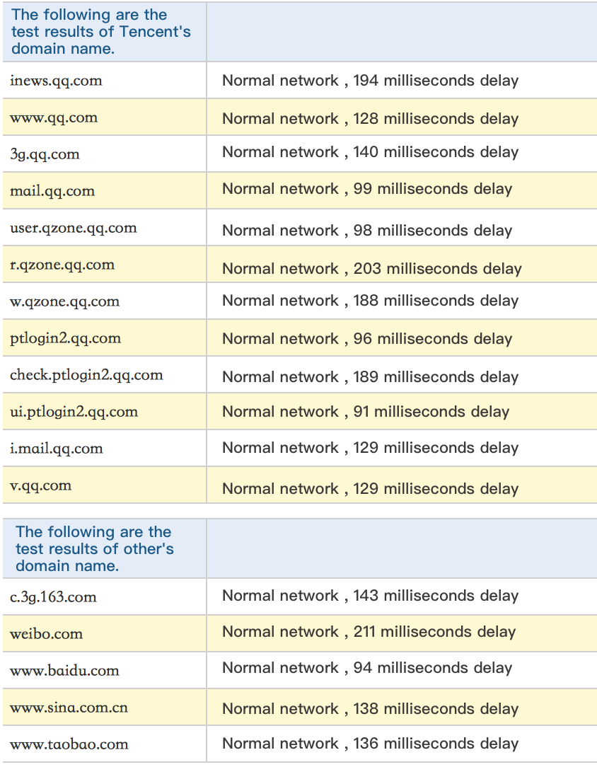 結果から各ドメイン名にアクセスする時のレイテンシーを確認し、ネットワークが正常であるかどうかを確認できます。