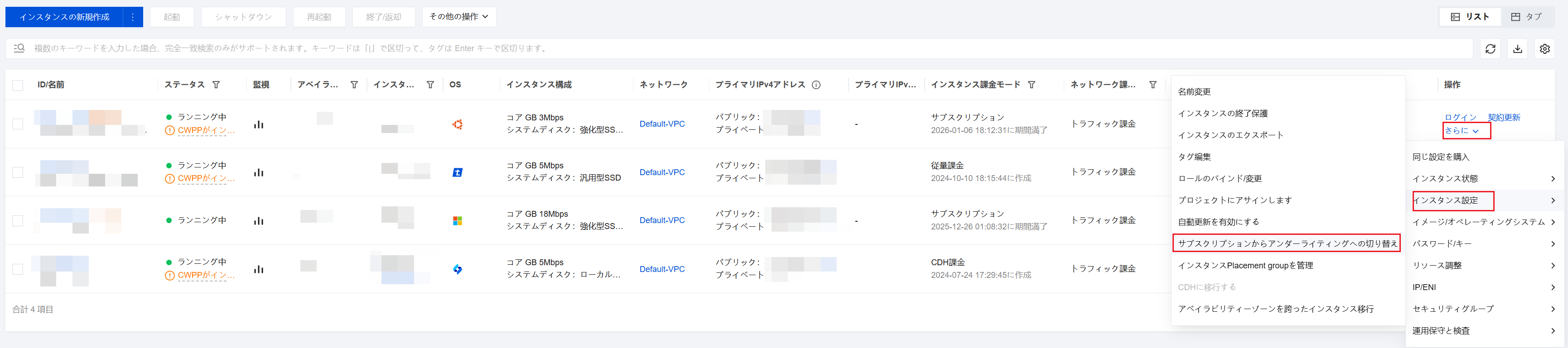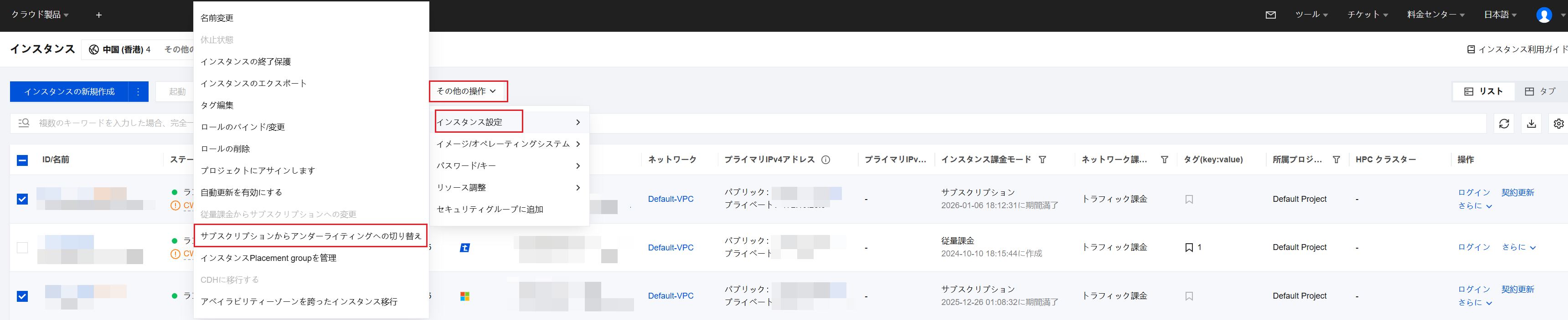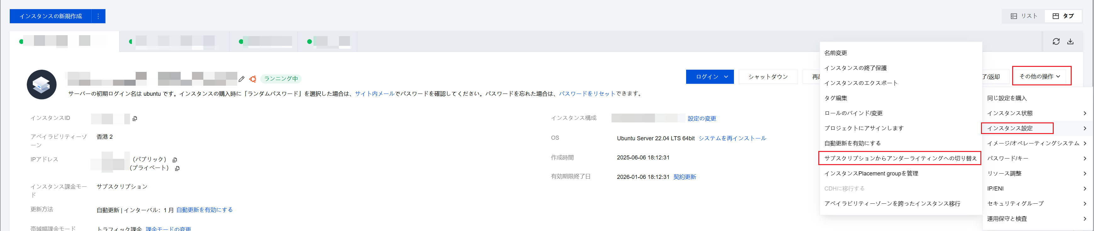 リストビュー:右側の操作列で、その他 > インスタンス設定 > サブスクリプション(月額・年額)を契約型課金へ変更の順に選択します。下図をご参照ください。
