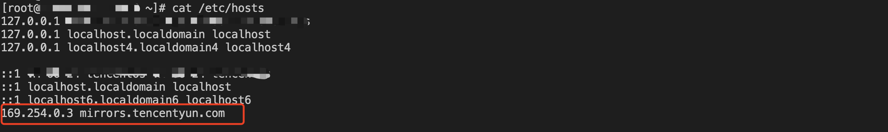 ドメインの名前解決に失敗する問題が発生した場合、/etc/hostsに169.254.0.3 mirrors.tencentyun.comを設定してソフトウェアリポジトリの名前解決を行うことができます。追加後の内容は以下の図の通りです。