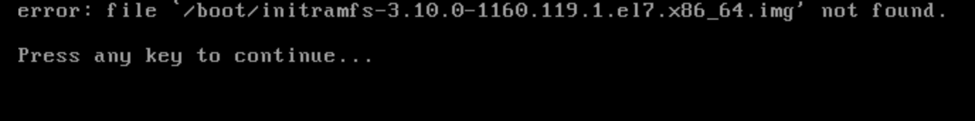 コマンドの実行中またはシステム起動プロセス中に、VFS: Unable to mount root fs on unknown-block またはerror: file '/boot/initramfs-`uname -r`.img' not found などのエラーメッセージが表示されます。