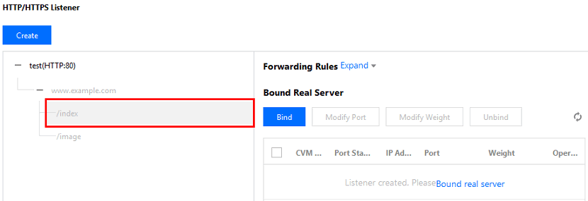 1. 先にCLBリスナーの設定をする必要があります。詳細については、CLBリスナーの概要をご参照ください。 2. 作成が完了したリスナーの左側の**+ **をクリックし、ドメイン名およびURLパスを表示します。具体的なURLパスを選択すると、リスナーの右側からバインド済みのバックエンドサービスを確認することができます。
