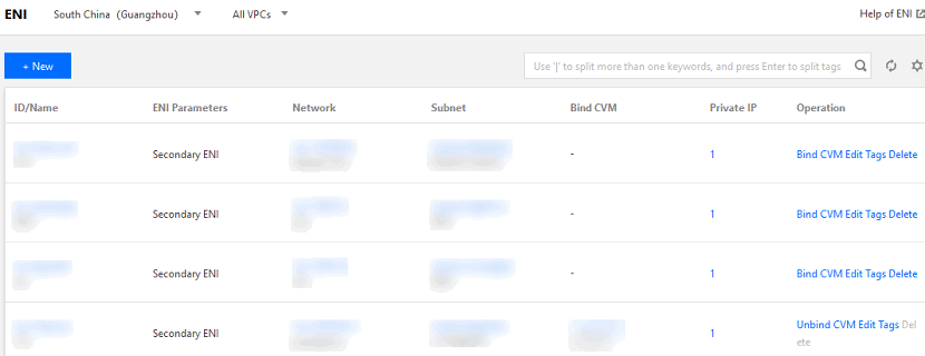 ENIが、あるCVMを先にバインドすることによって、CLBはそのENIをバインドすることができます。CLBは、CLBによるトラフィックの転送のみを行い、ビジネスロジックの実際の処理は行わないため、コンピューティングリソースのCVMインスタンスによってユーザーのリクエストを処理する必要があります。まずはENIコンソールに進み、必要なENIとCVMにバインドを行ってください。 操作手順
