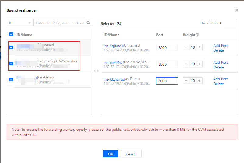 3. バインドをクリックすると、ポップアップボックスでバインドしたいバックエンドサーバーを選択し、サービスポートと重みを設定することができます。バックエンドサービスをバインドする場合は、「CVM」または「ENI」を選択することができます。