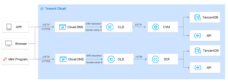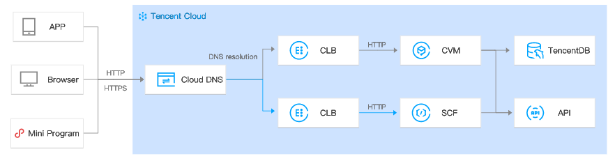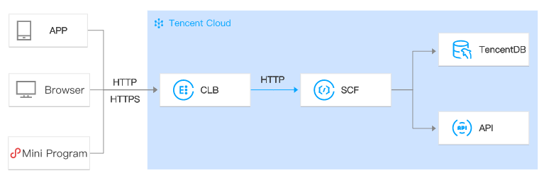1. App、ブラウザ、H5、ミニプログラムなどからHTTP/HTTPSリクエストを送信し、CLBを介してSCFにアクセスします。