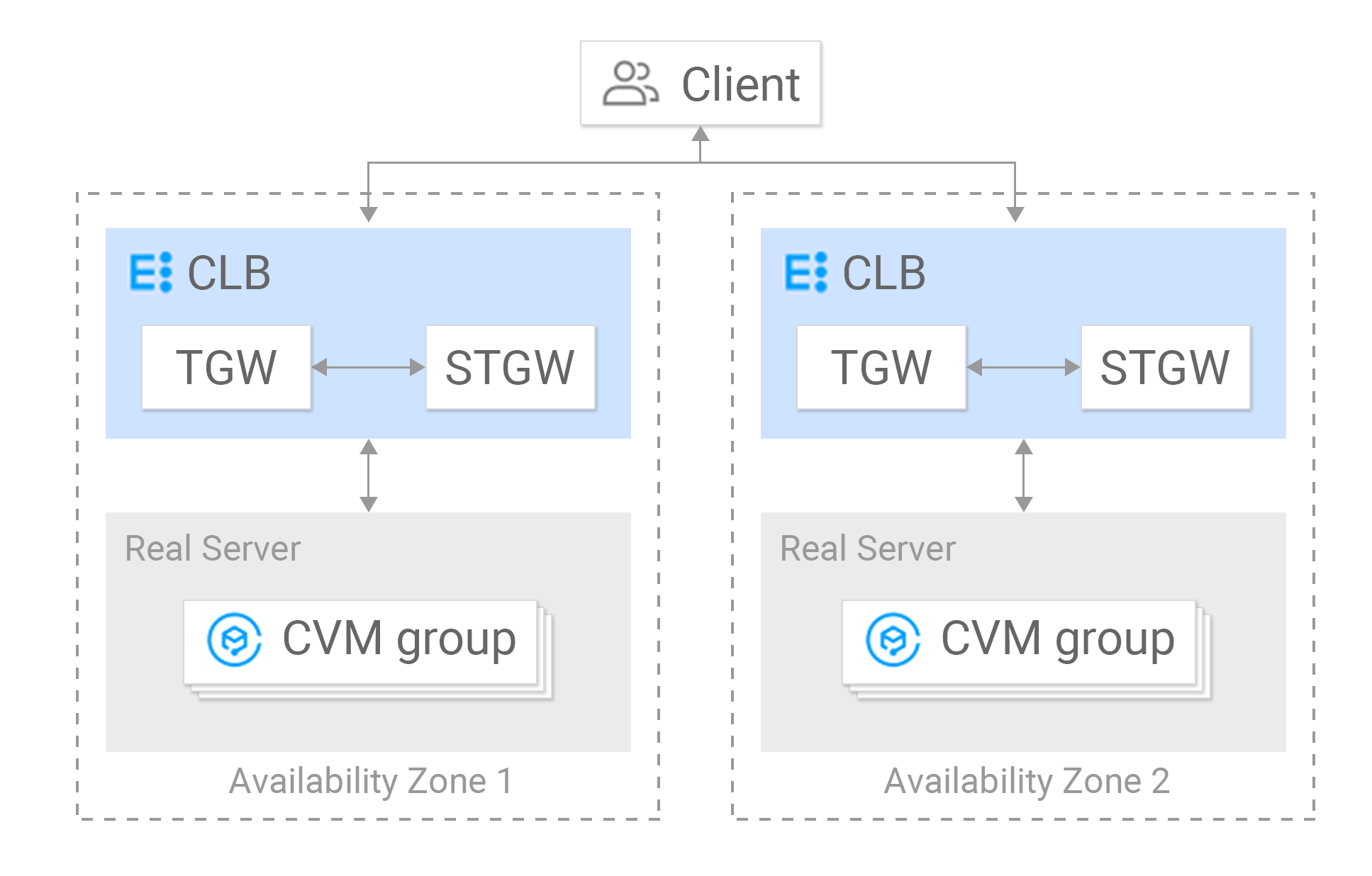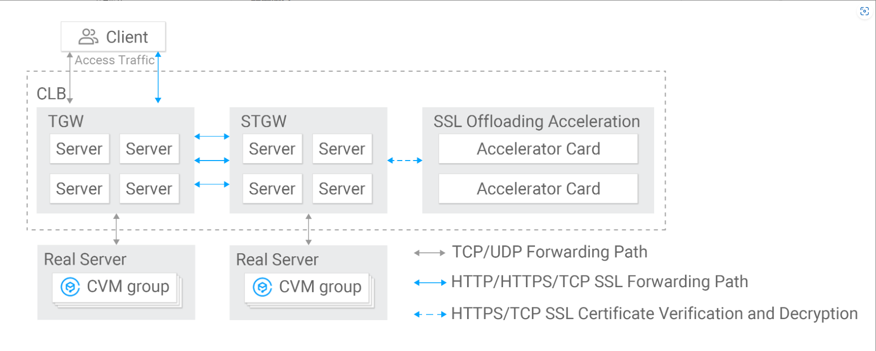 CLBは業務トラフィックの転送を行い、バックエンドサービスが業務リクエストを実際に処理します。CLBとバックエンドCVMの間の通信はTencent Cloudプライベートネットワークによって行います。TGWとSTGWはどちらも複数のサーバーにデプロイし、クラスターによってロードバランシングサービスを提供します。CLBの転送パスは下図のとおりです。