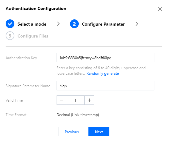 認証キーをカスタマイズする:キーは6~40桁のアルファベットの大文字、小文字と数字で構成されています。キーを大切に保管してください。ユーザー側とサーバー側のみ知っている必要があります。