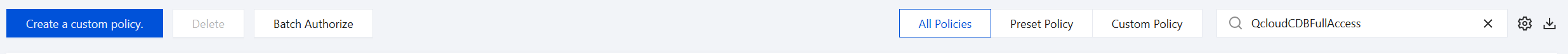 ポリシー管理 画面に移動し、右上の検索ボックスで QcloudCDBFullAccess を検索すると、このポリシーが見つかります。 ポリシー構文は以下のとおりです。