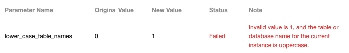 このインスタンス配下のデータベースとテーブルがすべて小文字であるかどうかを確認します。大文字のデータベーステーブル名がある場合は、それらをすべて小文字に変更してから、lower_case_table_namesパラメータを変更してください。